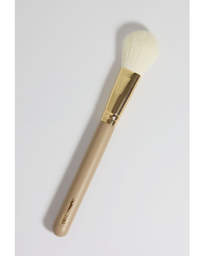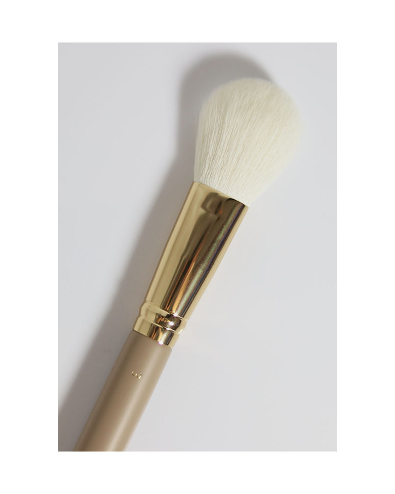 Wyjątkowy design sprawia, że Pędzel nr 3 to nie tylko narzędzie, ale i ozdoba Twojej kosmetyczki: drewniany trzonek w kolorze nude, elegancka złota skuwka i kontrastujące białe włosie tworzą luksusowy, minimalistyczny look.